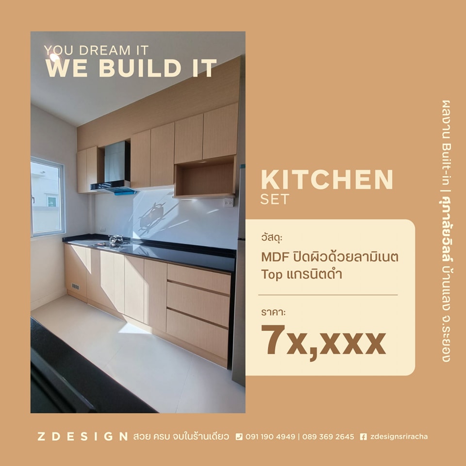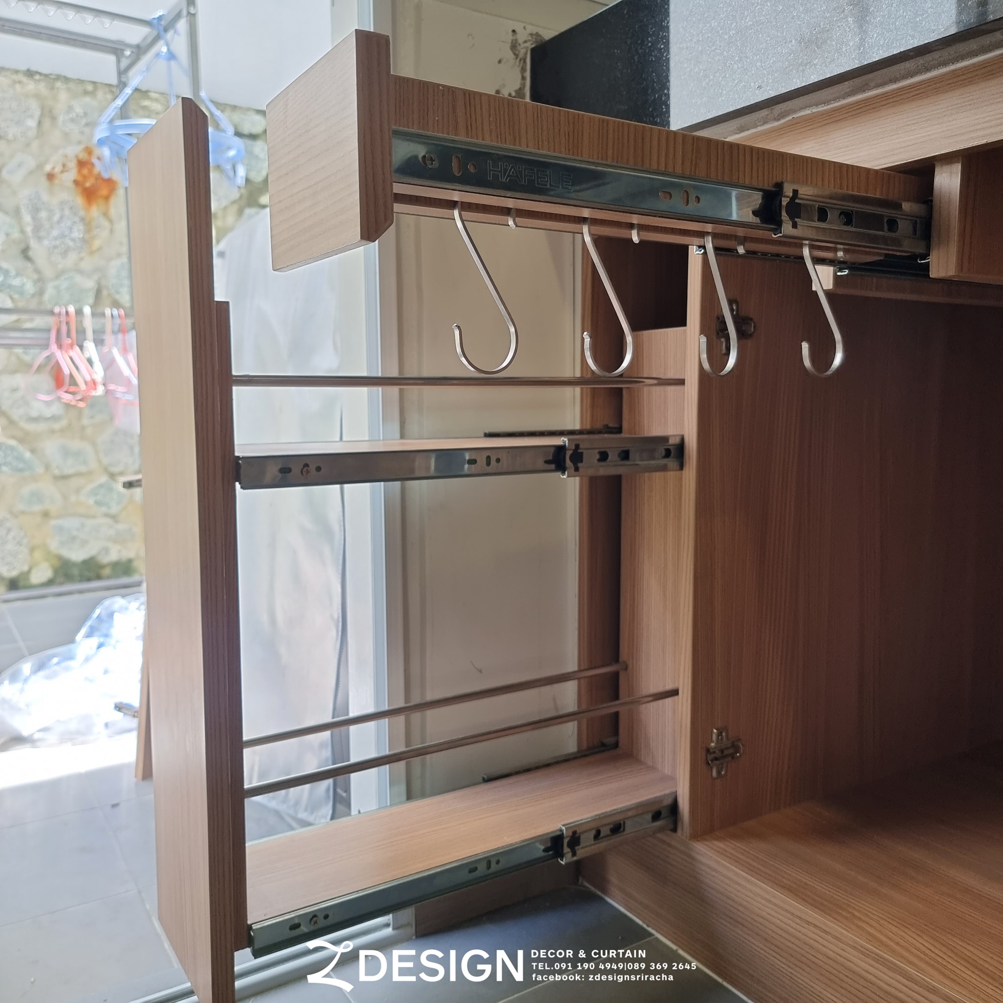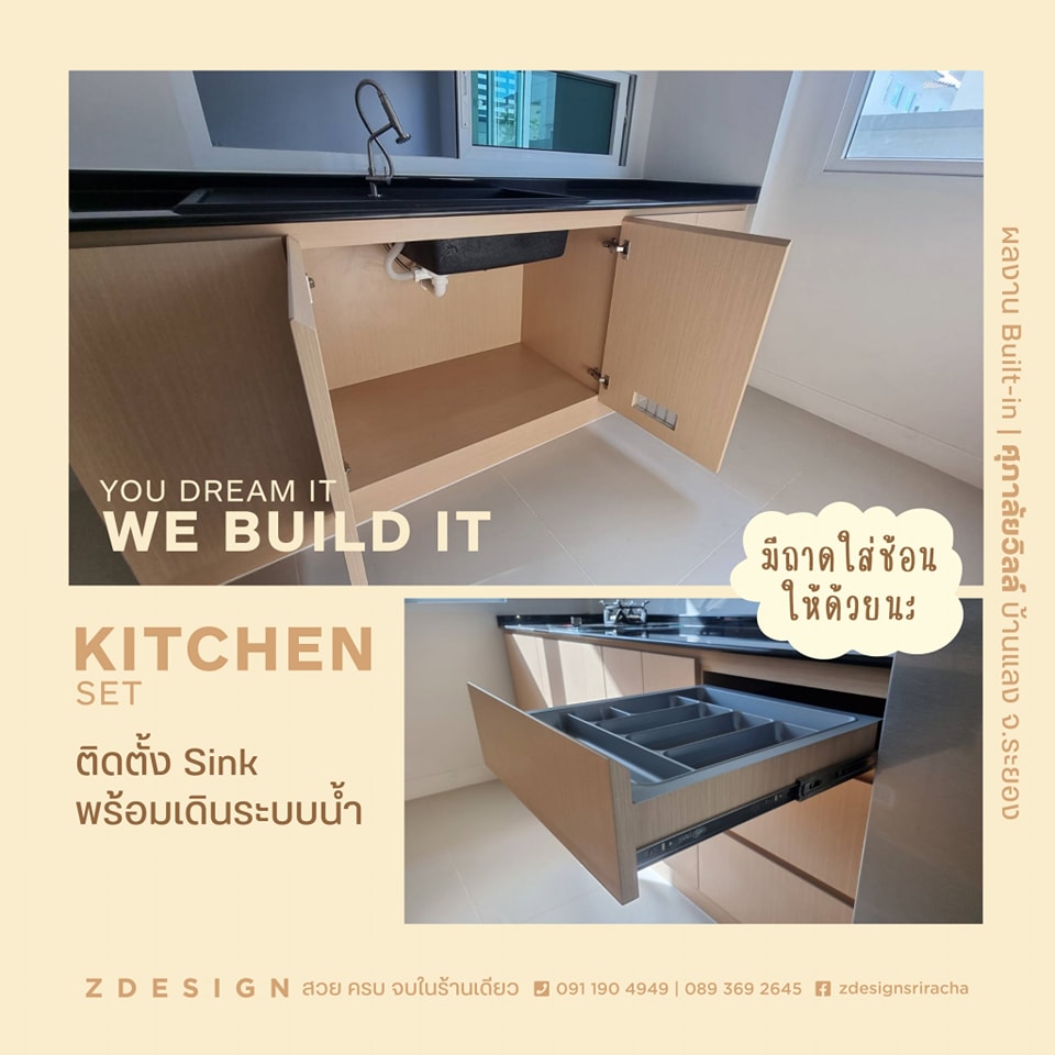 ผลงานบิวท์อินครัว งาน MDF ปิดผิวด้วยลามิเนต ทั้งภายในภายนอก Top แกรนิตดำ ติดตั้ง Sink พร้อมเดินระบบน้ำ มีถาดใส่ซ้อนส้อม