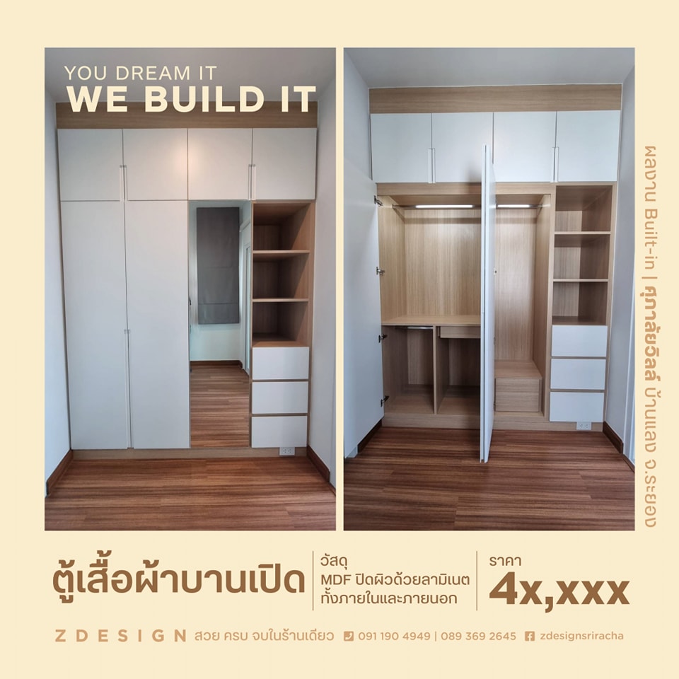 ผลงานบิวท์อินตู้เสื้อผ้าบานเปิด วัสสดี MDF ปิดผวด้วยลามิเนตทั้งภายในและภายนอก ดีไซน์สวยงาม ทันสมัย คุ้มค่าทุกตารางนิ้ว เก็บสีเนี๊ยบทุกเม็ด