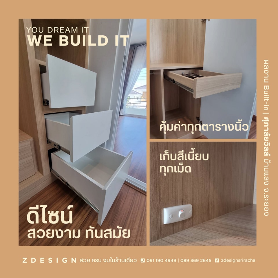 ลูกค้าที่กำลังมองหาร้านบิ้วอิน สำหรับ Zdesign ออกแบบ 3D ให้ลูกค้าเห็นก่อน เพื่อให้ลูกค้าได้เห็นรูปร่างออกว่า ทางร้านกับลูกค้าเข้าใจรูปแบบตรงกัน (ต้องการให้ปรับแก้ตรงไหน แก้ไขได้ปรับแก้ได้ 3 ครั้ง) หลังจากแบบ 3D ปรับแก้จนเป็นที่พอใจ ทางร้านจะส่งแบบสำหรับผลิตให้ลูกค้าตรวจอีกรอบ